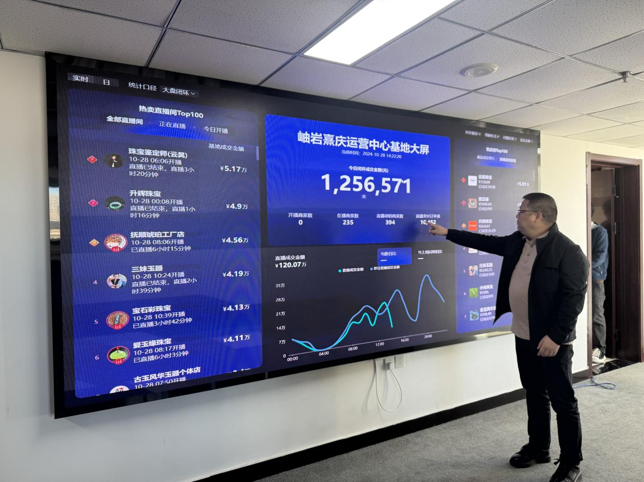 “1256571元,這是我們一上午的交易額”,岫巖熹慶運營中心的負責人指著墻上的大屏幕說:“通過這塊屏幕,不僅能實時看到各家商戶的開播、交易情況,還可以通過數據的波動及時發現存在的問題。”