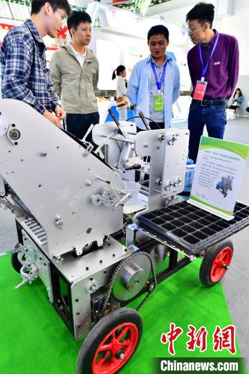 圖為展會(huì)上展示的可實(shí)現(xiàn)全自動(dòng)送苗、取苗、種苗、覆土等功能的蔬菜移栽機(jī)。中新網(wǎng)記者 張斌 攝