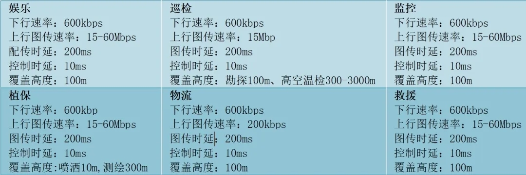 //行業對業務數據鏈路的訴求是:低空300米無縫覆蓋,上行傳輸帶寬15-60Mbps,飛行控制時延10ms。