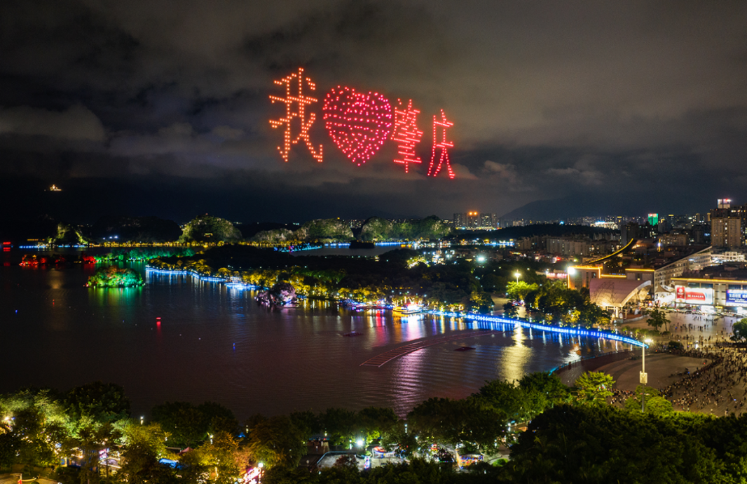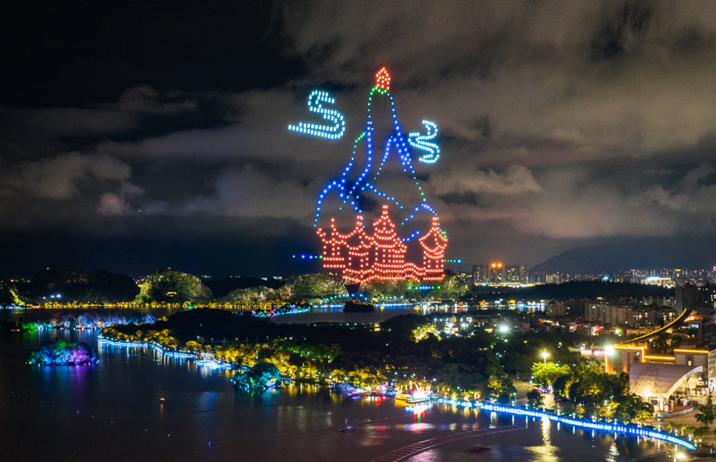 在2024第二屆肇慶環(huán)星湖藍帶啤酒嘉年華的開、閉幕式上,以東門廣場為臺,以星湖夜景為幕,千架無人機繪就了一幅魅力肇慶的絢麗畫卷。