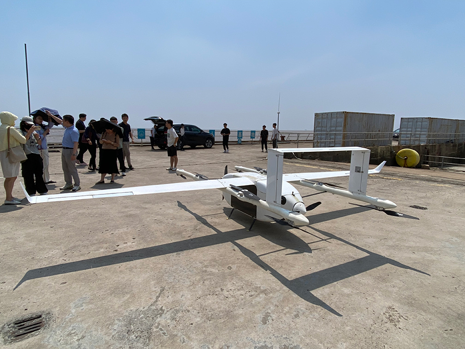 8月22日上午,一架白色垂直起降固定翼無人機(jī)“豐舟90”從上海市金山區(qū)城市沙灘旁的水上平臺起飛,飛向大海那邊的舟山群島。