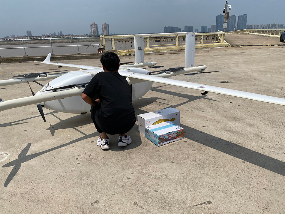 在經(jīng)過一個閉環(huán)的海上飛行演示后,這架“滿載而歸”的無人機(jī)重新進(jìn)入人們的視野,并穩(wěn)穩(wěn)降落在水上平臺。早已等候在此的貨運人員打開無人機(jī)的貨倉蓋,從里面端出了新鮮的舟山海鮮和桃花島大黃魚……