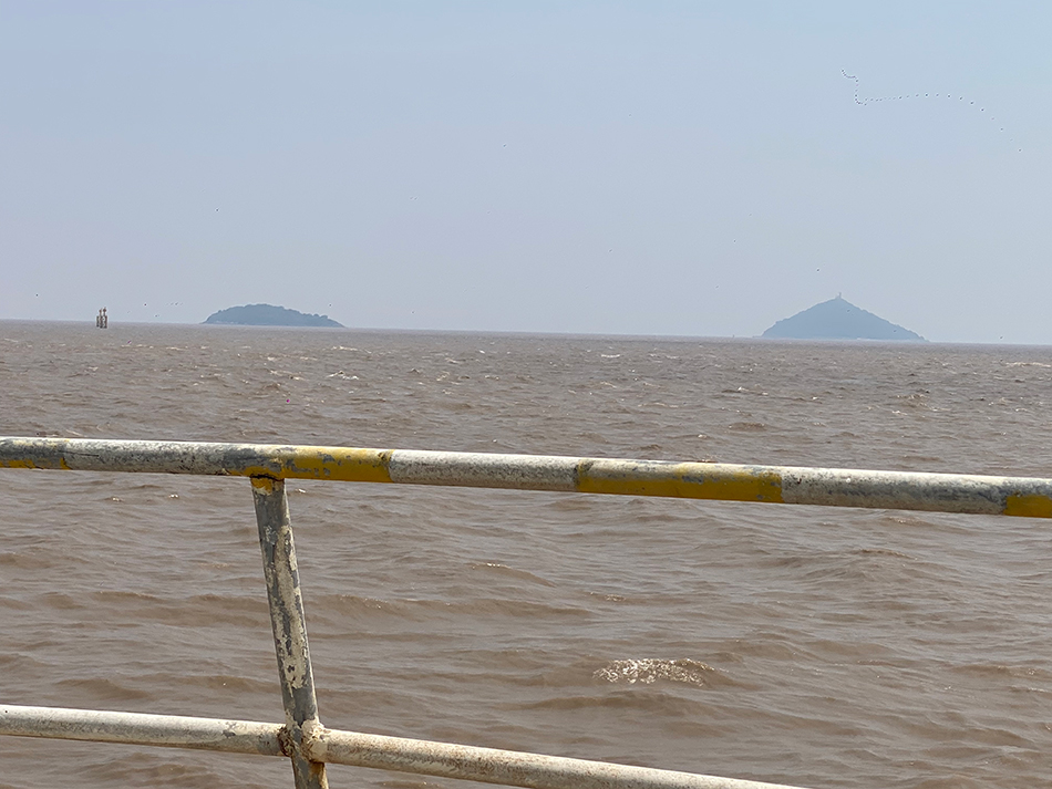 站在無人機(jī)起飛的金山區(qū)水上平臺,對面海面上的金山三島清晰可見。