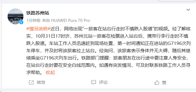 隨后,上海鐵路局蘇州站官方微博@鐵路蘇州站 發布情況說明:近日,網絡出現“一旅客在站臺行走時不慎跌入股道”的視頻。經了解核實,10月31日17時許,蘇州北站一旅客在檢票進入站臺后,攜帶行李行走時不跌入股道,車站工作人員迅速趕到現場處置,第一時間通知正在進站的G7196次列車停車,并及時將該旅客拉上站臺。經詢問,該旅客表示身體并無大礙,隨后其繼續乘坐G7196次列車出行。