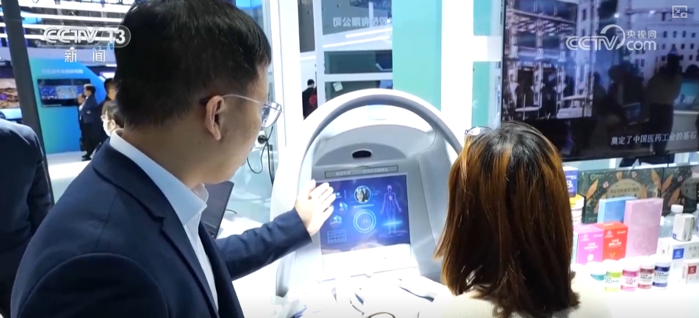 在數(shù)博會(huì)的現(xiàn)場,一家醫(yī)藥企業(yè)的展區(qū)排起了長隊(duì)。參展人員把雙手放到儀器上,臉部對(duì)準(zhǔn)攝像頭,可以檢測出自身的健康狀況。