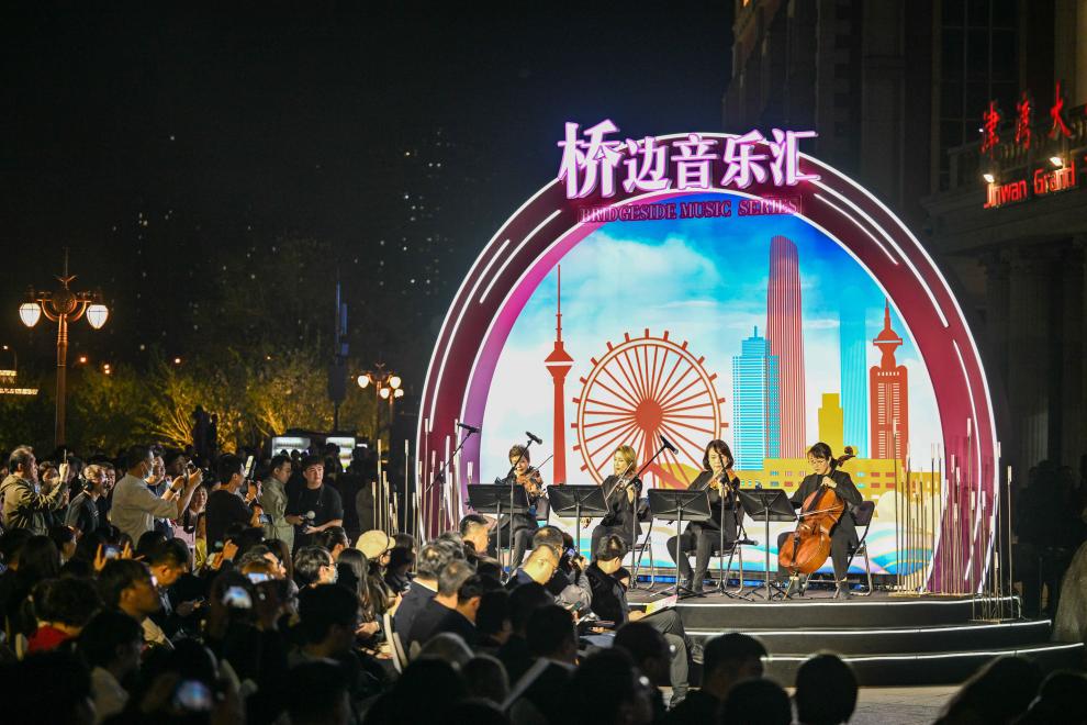持續舉辦的海河龍舟賽、“橋見海河 邂逅浪漫”主題音樂匯等特色活動,以及沿岸載體推出的光影主題秀、無人機展演、街頭跳高等商旅文體融合活動,也讓“海河+”內涵愈發豐富。天津交響樂團的演奏者在天津津灣廣場親水平臺為市民游客演出。新華社記者孫凡越攝