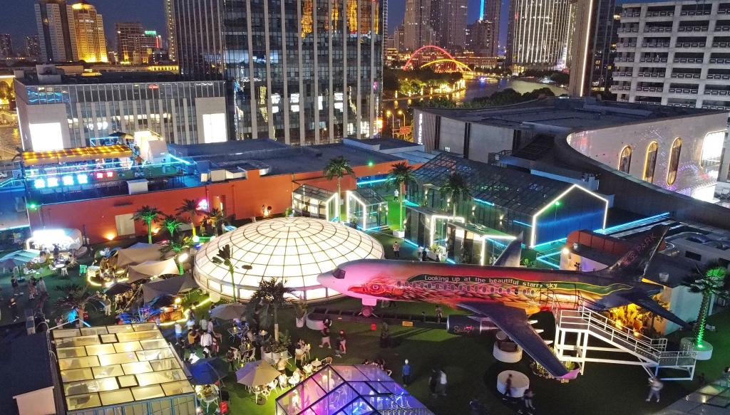 天津和平印象城項目合伙人鄭崢說,自開業以來,和平印象城的客流量達1600萬人次,銷售額7.13億元,引入商家約150戶,引入首店占比超60%。這是和平印象城樓頂的“飛機IP”主題酒吧。新華社記者趙子碩攝