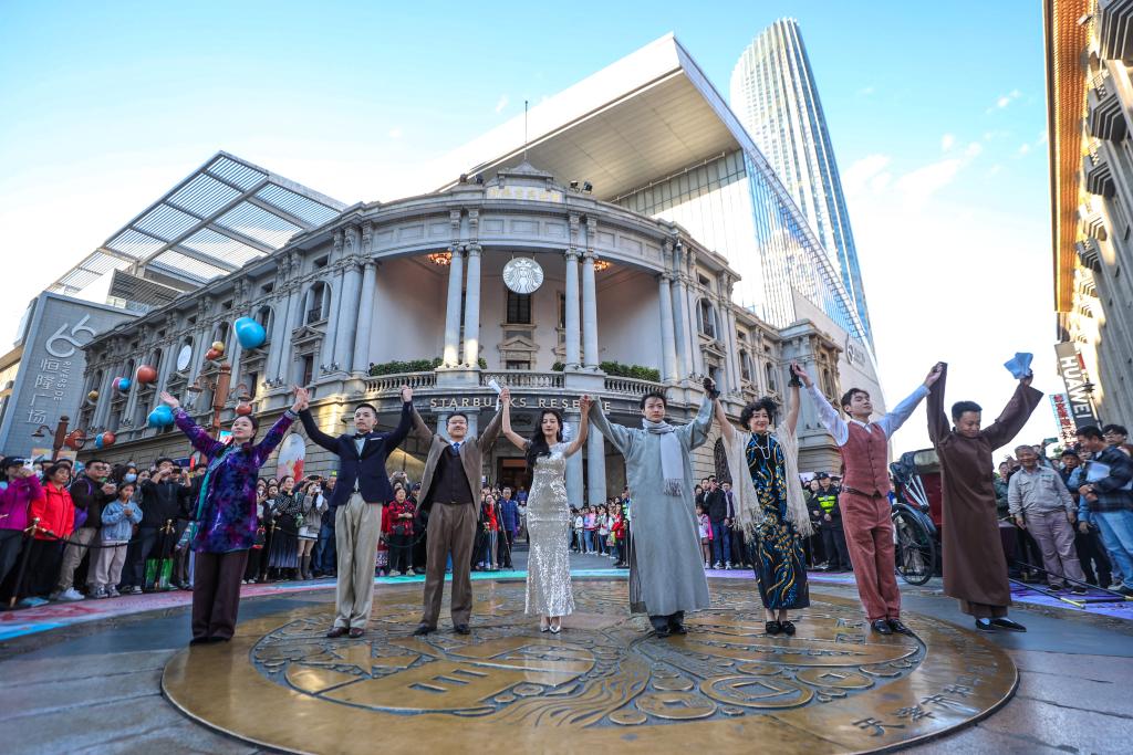 在天津重要地標金街大銅錢廣場,這里緊鄰近代劇作家曹禺創作戲劇《日出》的背景地——惠中飯店原址。國慶期間,天津人民藝術劇院的演員以巨型銅幣鑲地式紀念浮雕為舞臺,生動再現了中國現代話劇史上的瑰寶《日出》經典片段,觀眾仿佛穿越回百年前,置身陳白露的奢華舞會之中,回味民國時期的天津往事與風土人情。《日出》經典片段在天津金街大銅錢廣場上演。新華社發