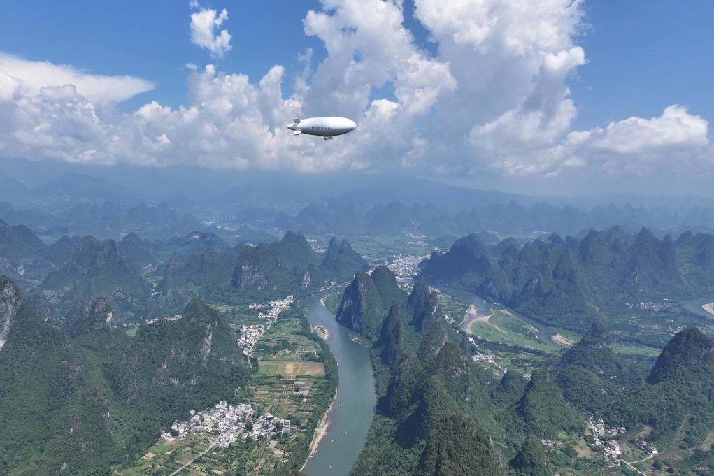 9月14日,“祥云”AS700載人飛艇在廣西陽朔進行演示飛行(無人機照片)。新華社發(中國航空工業集團特種飛行器研究所供圖)