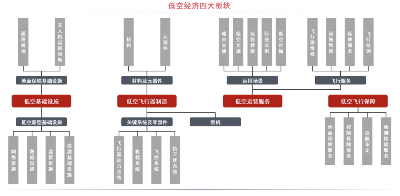 中信證券在近期研報中指出,低空經(jīng)濟的產(chǎn)業(yè)鏈長、輻射范圍廣,上游主要為構(gòu)建中游各類低空產(chǎn)品的原材料(包括金屬原材料、特種橡膠與高分子材料等)與核心零部件(包括電池、電機、飛控、機體等);中游主要為低空產(chǎn)品制造、低空飛行、低空保障與綜合服務等;下游主要為運營和各種應用場景(包括旅游業(yè)、物流業(yè)、文旅業(yè)與巡檢業(yè)等)。
