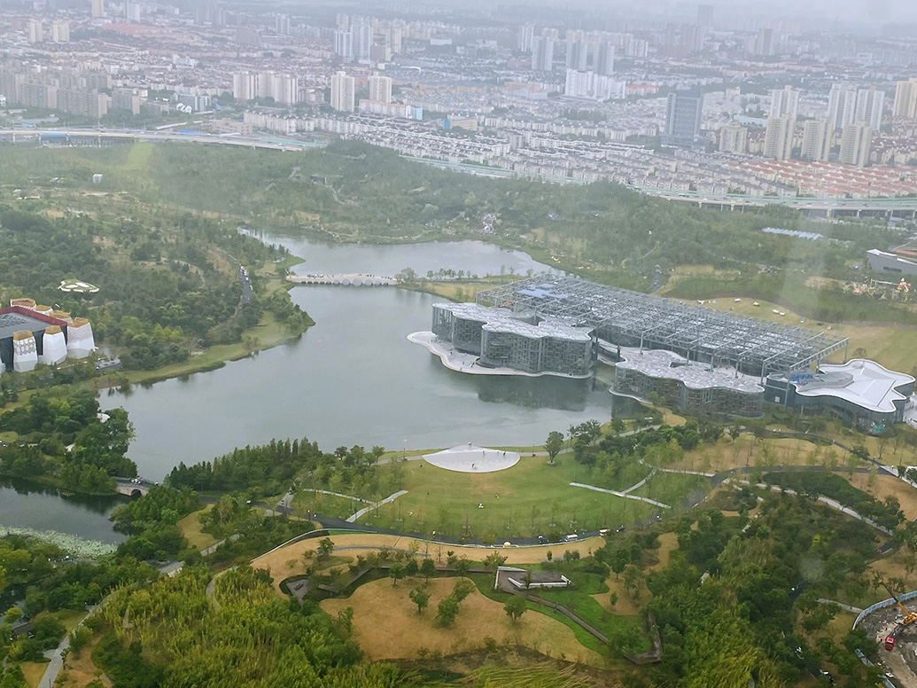 在直升機(jī)上俯瞰世博文化公園雙子山