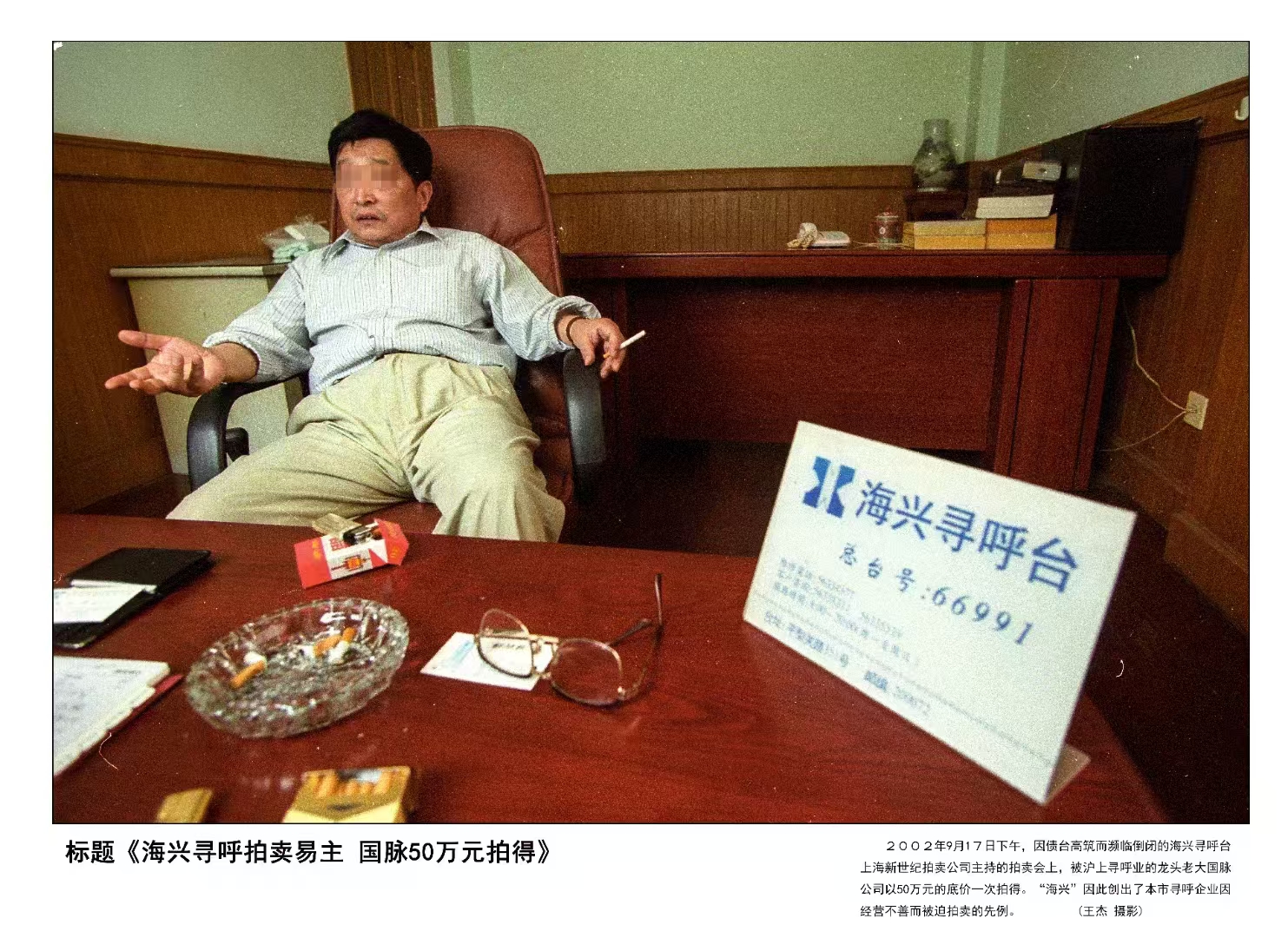 2002年9月17日,因債臺高筑而瀕臨倒閉的海興尋呼臺在上海新世紀拍賣公司主持的拍賣會上,被滬上尋呼業的龍頭老大國脈公司以50萬元的底價一次拍得。王杰 攝