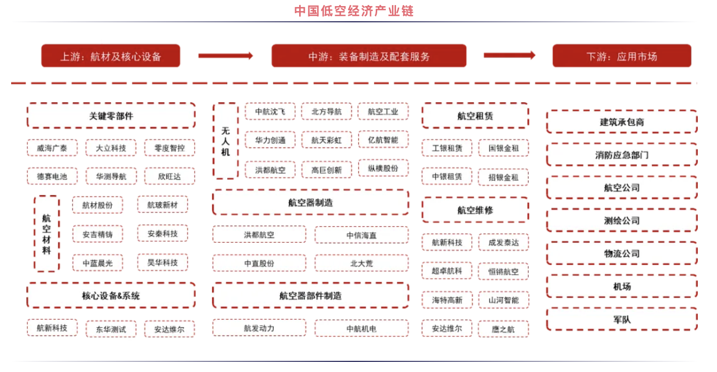 中信證券在近期研報(bào)中指出,低空經(jīng)濟(jì)的產(chǎn)業(yè)鏈長(zhǎng)、輻射范圍廣,上游主要為構(gòu)建中游各類低空產(chǎn)品的原材料(包括金屬原材料、特種橡膠與高分子材料等)與核心零部件(包括電池、電機(jī)、飛控、機(jī)體等);中游主要為低空產(chǎn)品制造、低空飛行、低空保障與綜合服務(wù)等;下游主要為運(yùn)營(yíng)和各種應(yīng)用場(chǎng)景(包括旅游業(yè)、物流業(yè)、文旅業(yè)與巡檢業(yè)等)。