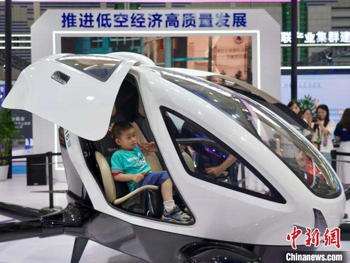 第十四屆智慧城市與智能經濟博覽會現場,一位小朋友在展區試乘無人駕駛載人航空器。董易鑫 攝