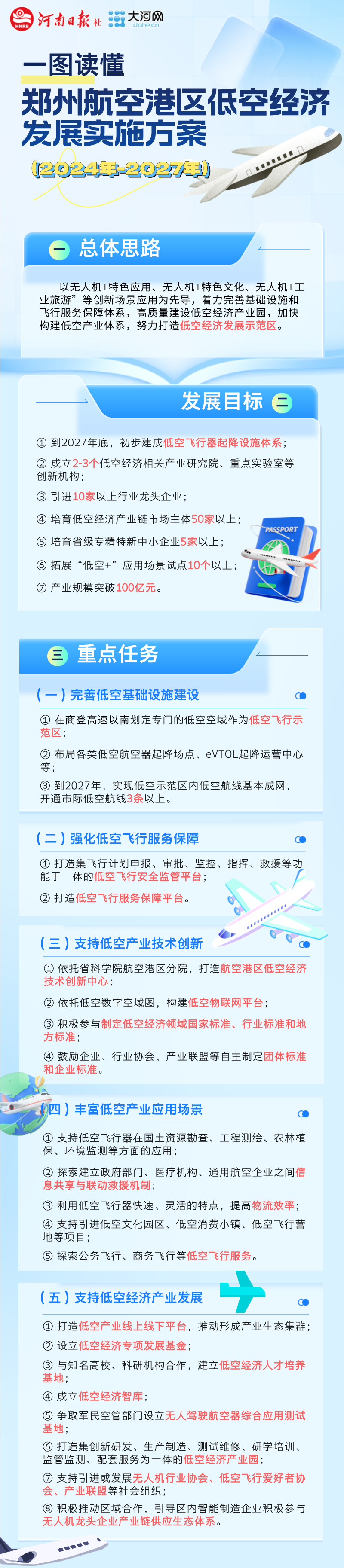 打造低空經(jīng)濟發(fā)展示范區(qū)、設(shè)立低空經(jīng)濟技術(shù)創(chuàng)新中心、創(chuàng)新低空技術(shù)使用場景……近日,鄭州航空港區(qū)發(fā)布《鄭州航空港區(qū)低空經(jīng)濟發(fā)展實施方案(2024年—2027年)》,加快開辟發(fā)展新賽道,讓低空經(jīng)濟“振翅高飛”。