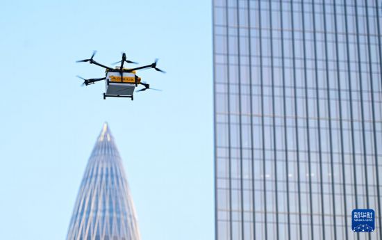 美團(tuán)送餐無人機(jī)穿行在深圳市后海片區(qū)的樓宇之間(2023年11月24日攝)。新華社記者 毛思倩 攝