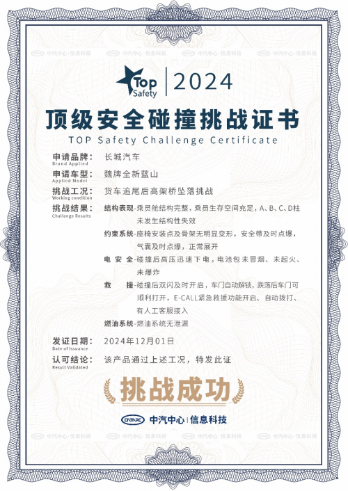 2024年12月2日-4日,在第13個全國交通安全日之際,作為長城汽車旗下高端新能源品牌,魏牌攜手中汽中心TOP Safety開展了一場難度極大的“行業(yè)首個高架橋墜落挑戰(zhàn)”。作為此次挑戰(zhàn)的主角,魏牌全新藍(lán)山以卓越的整車、電池、主被動、智駕等安全性能,成功通過這一極限測試,再次印證了其在安全領(lǐng)域的強(qiáng)勁實(shí)力和領(lǐng)先地位。