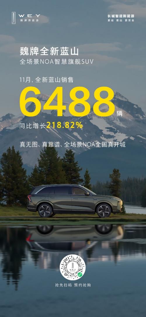 憑借全面卓越的硬核實(shí)力,全新藍(lán)山以頭部優(yōu)等生的姿態(tài)披荊斬棘,持續(xù)贏得市場與用戶的廣泛認(rèn)可與信賴,引領(lǐng)了大六座新能源SUV市場的發(fā)展方向。據(jù)最新銷量數(shù)據(jù)顯示,魏牌全新藍(lán)山11月銷售6488輛,同比增長218.82%,保持強(qiáng)勁增勢,不斷綻放中國智造高端實(shí)力的“魏牌風(fēng)采”。