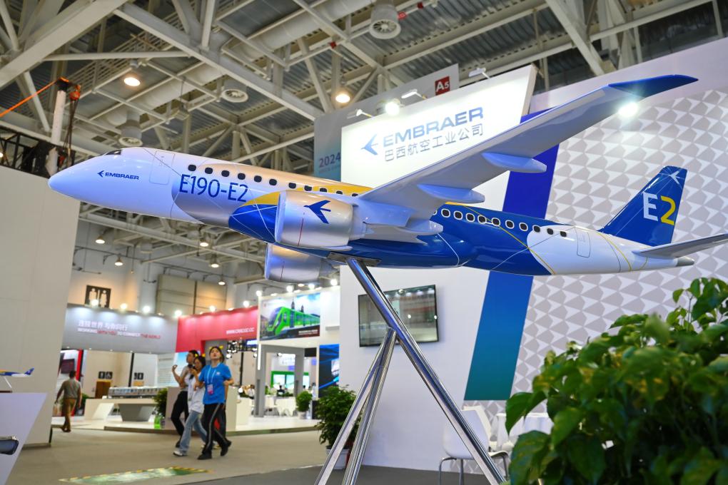 這是在廈門舉行的2024金磚國家新工業革命展巴西展位展出的E190-E2飛機模型(2024年9月10日攝)。新華社記者林善傳攝