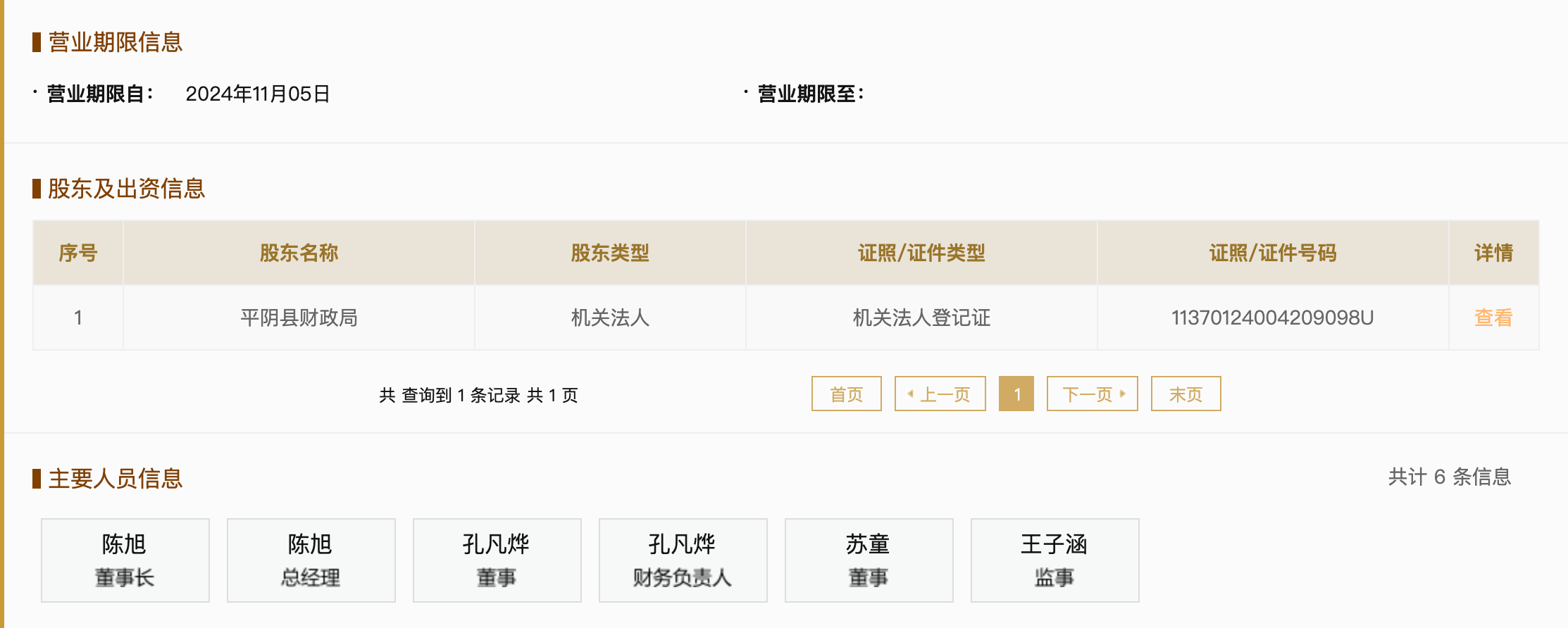 據國家企業信用信息公示系統顯示,山東金宇通用航空有限公司成立于2024年11月5日,位于山東省濟南市平陰縣。股東為平陰縣財政局,認繳額為2億元。公司董事長及總經理為陳旭。而11月5日,也是此前招標公告的發布日期。