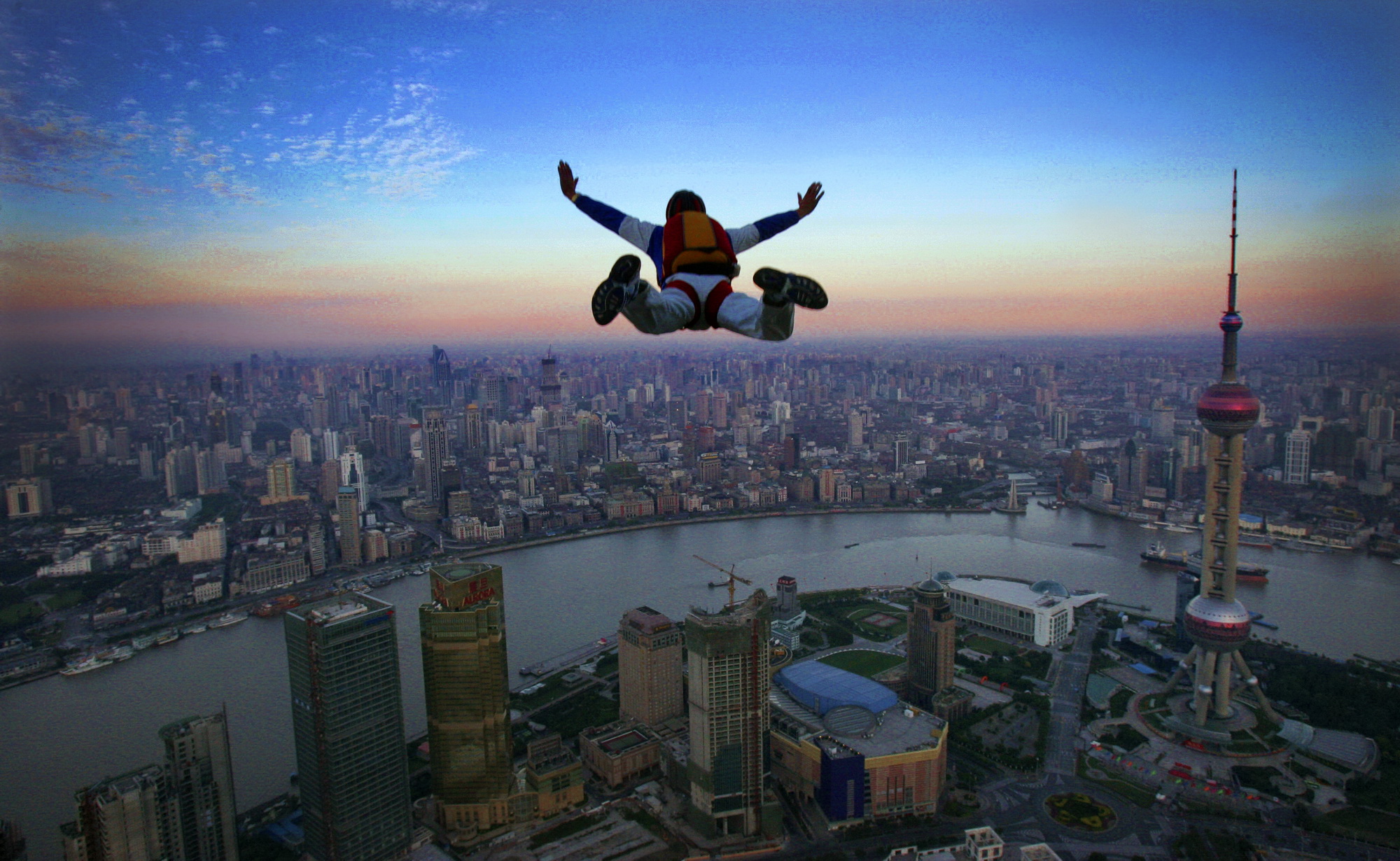 2003年10月6日,15位世界頂級低空跳傘運動員從上海金茂大廈88層平臺跳下,起跳高度345米,超過了馬來西亞 “雙子塔”表演跳傘時280米的起跳高度,創(chuàng)下了世界高樓跳傘的最高紀錄。當時,420.5米高的金茂大廈是世界第三高樓。