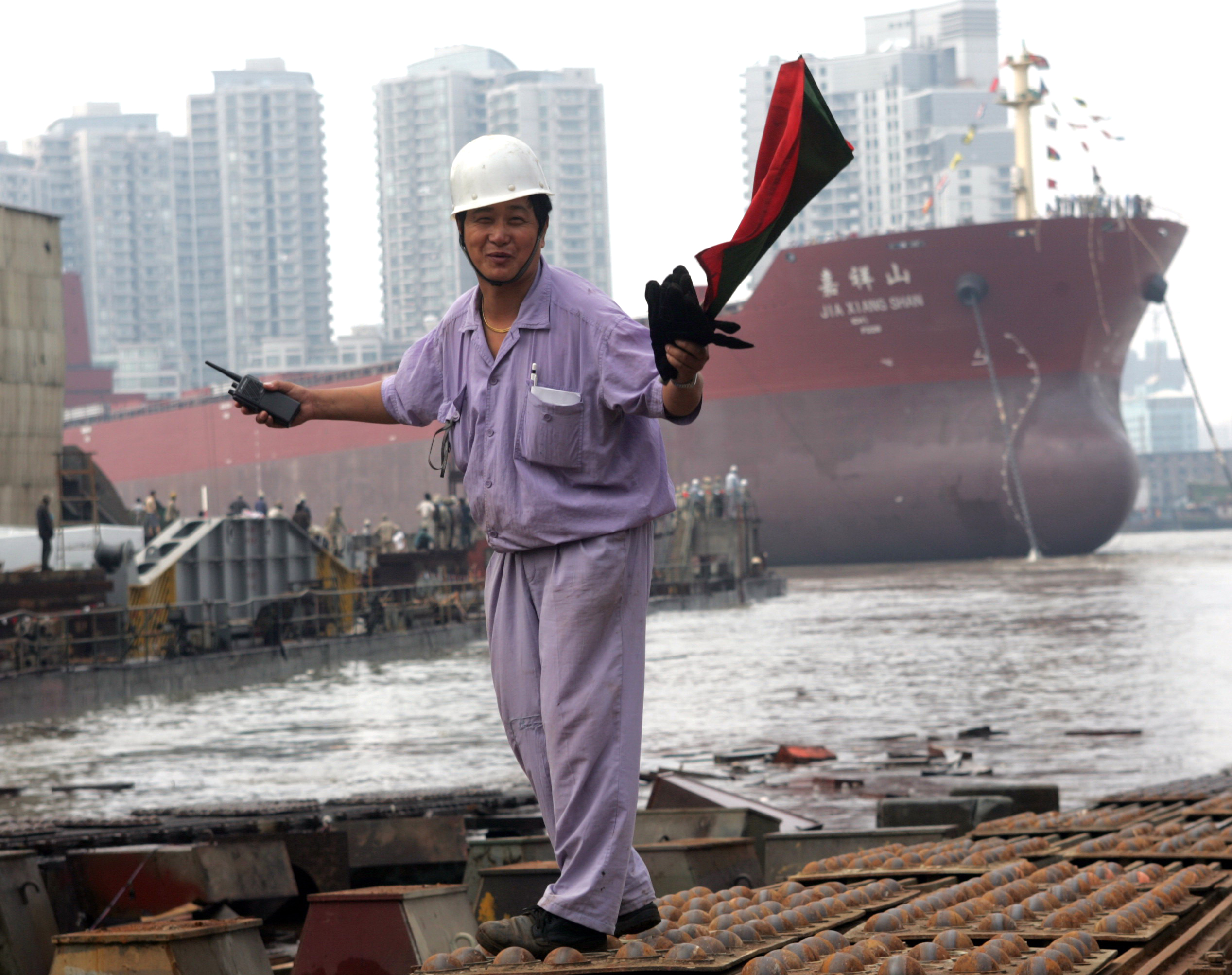 2004年8月20日,上海陸家嘴地區(qū)百年造船史上最后一艘“上海制造”的遠洋巨輪“嘉祥山”命名下水。隨后,這里的大部分船塢和船臺將逐步拆除,陸家嘴的造船史也隨之畫上“句號”。王杰 攝