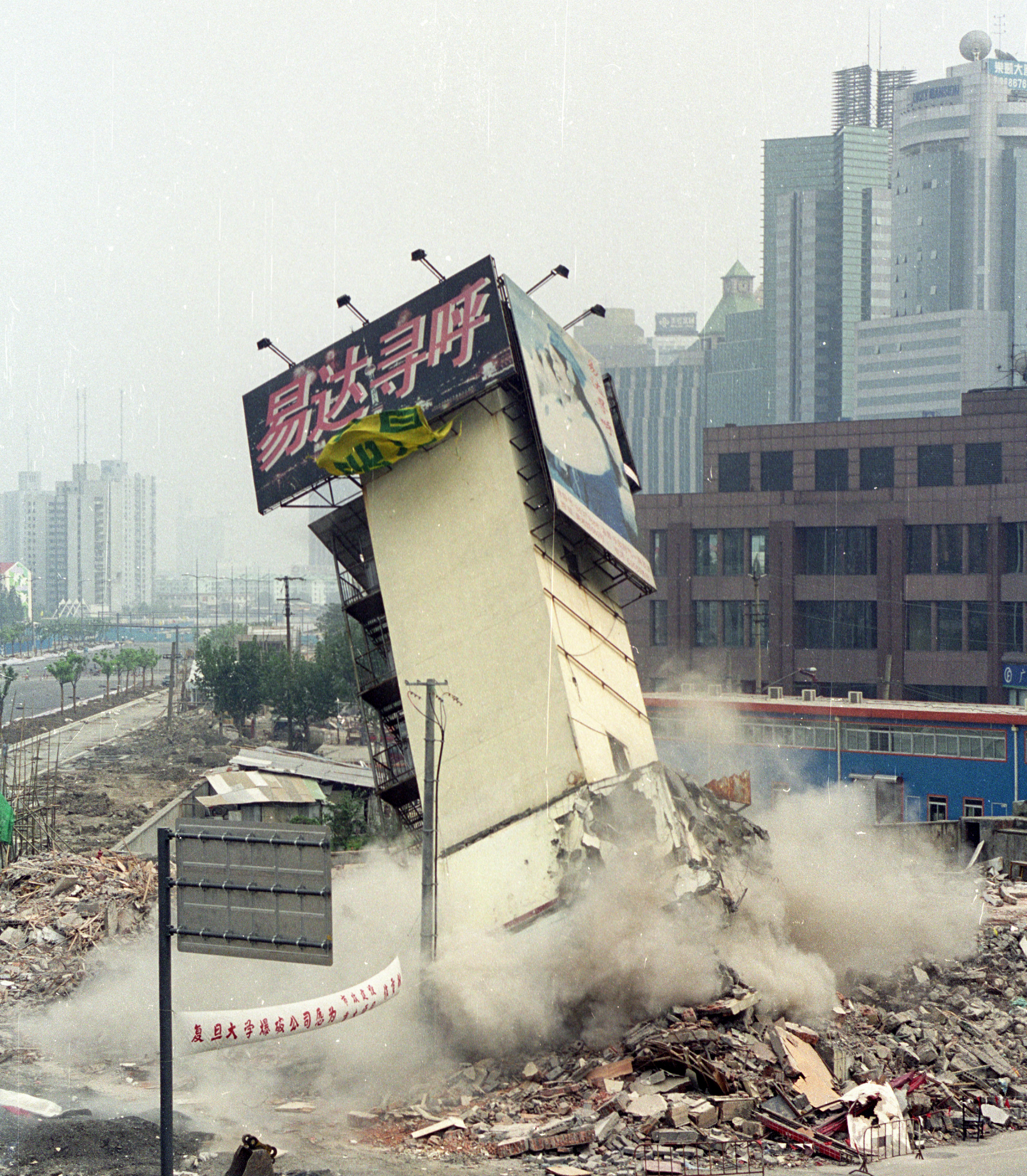“我當時的BB機就是易達尋呼的,號碼是126的。”王杰指著照片中一棟正在倒塌的建筑物頂樓的巨大廣告回憶道。這張照片拍攝于1999年9月13日,作為當時上海浦東第一高樓——東昌消防瞭望塔被爆破的瞬間,拍攝者正是王杰本人。