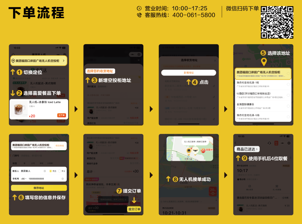 美團(tuán)無人機(jī)與微信港幣錢包(WeChat Pay HK) 攜手合作,航線支持異地下單及港幣支付的模式,從香港北上路途中,還沒到深圳就可修改收貨地址,先人一步點(diǎn)空投外賣,記得外賣地址認(rèn)準(zhǔn)“美團(tuán)福田口岸前廣場(chǎng)無人機(jī)空投柜”喔。
