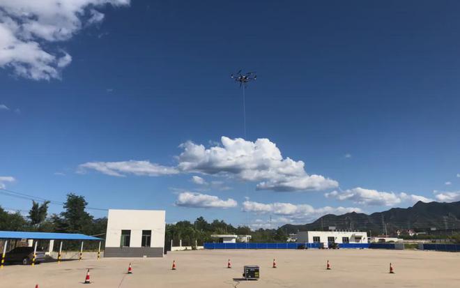 北京大工科技有限公司的廠房外,飛手正在測試一架多旋翼系留無人機。伴隨著螺旋槳迅速旋轉,無人機緩緩升空。