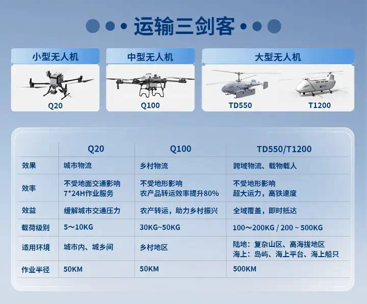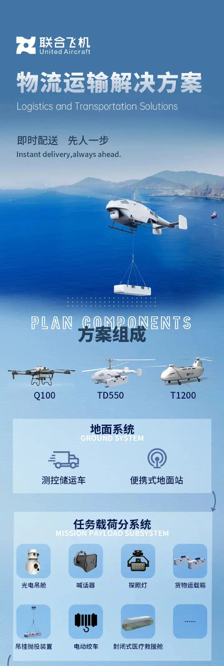 物資跨越山海,距離障礙在高科技的驅(qū)動下黯然失色。聯(lián)合飛機集大中小型無人機的獨特優(yōu)勢,推出運輸無人機“三劍客”。