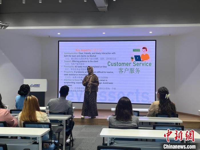 在位于嘉興經開區的浙江出海云(以下簡稱:出海云)技術有限公司內,來自嘉興大學的大二留學生王瑤(Oumaima),正在講臺上分享自己的“帶貨”心得。