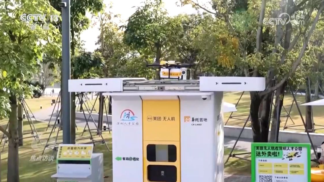 在深圳人才公園,一架無人機降落在外賣柜上方,通過精準定位系統(tǒng)將外賣投入柜中,顧客自助拿取,這種新穎的送餐方式也引來路過的游客紛紛下單。