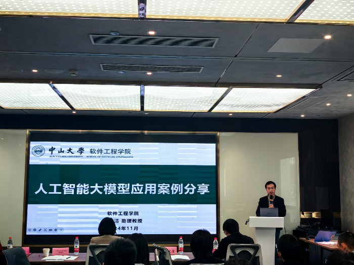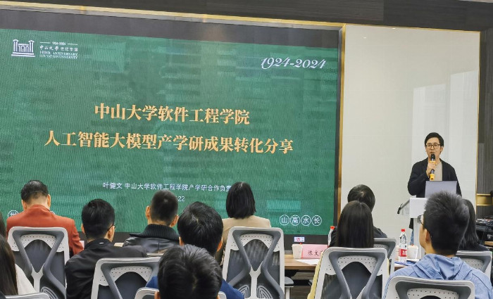 本次交流會邀請中山大學軟件工程學院的項目團隊進行現場成果分享。中山大學軟件工程學院產學研合作負責人、廣東省計算機學會數字經濟專委會秘書長葉健文分享了中山大學軟件工程學院產學研項目成果及合作服務(包括大模型研發、大模型測評、大模型備案、國家超算算力、大模型應用、專利轉讓等服務及案例)以及琶洲人工智能大模型政策;軟件工程學院助理教授、可信大模型研究中心副主任陳文清分享了人工智能大模型技術原理與全球最新資訊、以及學院金融大模型、電力大模型、中醫大模型研發經驗與應用成果。