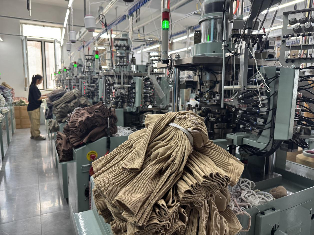 當前,小北河鎮(zhèn)的一些襪企不斷加大投入“智改數(shù)轉(zhuǎn)”,正逐步從4代電腦機向5代智能機升級,全新的產(chǎn)業(yè)活力不斷釋放。澳笠森襪業(yè)的生產(chǎn)車間里,織襪工人龐大姐把生產(chǎn)好的襪子整理好拿到成品區(qū):“不到3分鐘,就能織出一雙棉襪,我一個人能管十幾臺機器。”