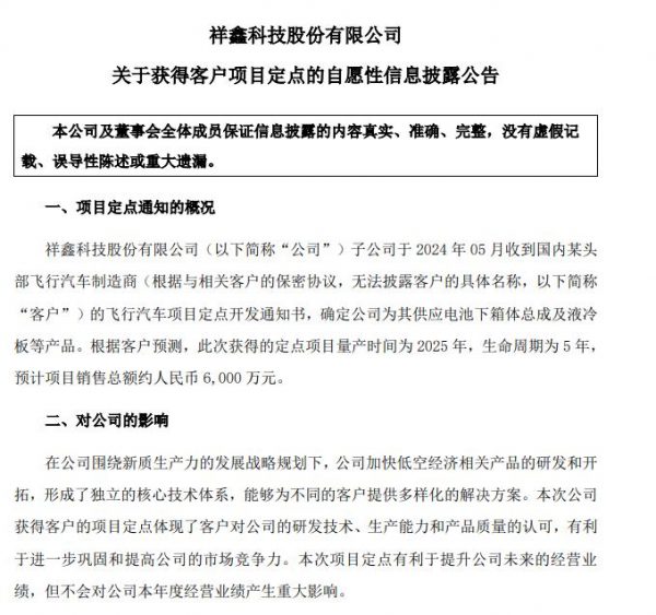 公告稱,祥鑫科技子公司于2024年5月收到國內(nèi)某頭部飛行汽車制造商的飛行汽車項(xiàng)目定點(diǎn)開發(fā)通知書,確定公司為其供應(yīng)電池下箱體總成及液冷板等產(chǎn)品。