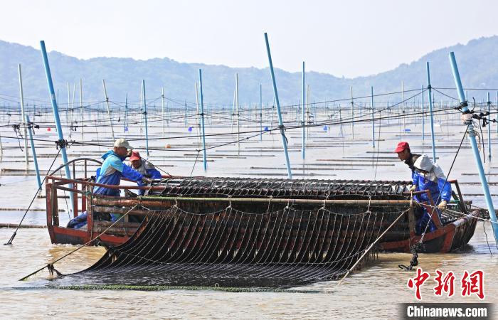 中新網寧德11月3日電 (夏巖緣)3日,位于福建省寧德福鼎市沙埕鎮的環敏灶灣海域,一根根玻璃鋼撐桿圍出了連片的紫菜養殖網格,一縷縷黑亮的紫菜如垂發般依附在網簾上。當地養殖戶們嫻熟地駕駛采收船穿梭在網格中,合力將網簾拉起放上收割機,開動機器,一簾簾的紫菜便齊刷刷地落在船艙里。