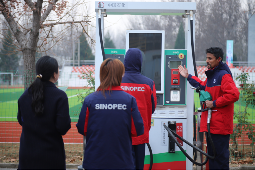 在中國石化北京石油實潤加油站,斯里蘭卡學員進行沉浸式實訓操作。