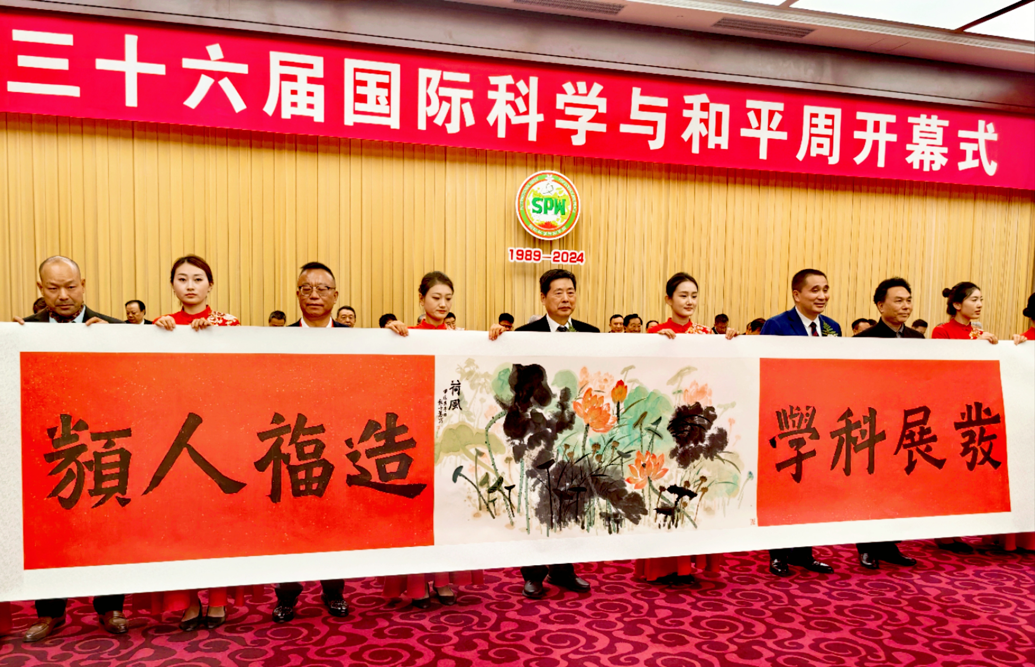 第三十六屆國際科學與和平周“和平之夜”聯誼晚會在北京國務院二招宴會廳舉辦。有關部委、人民團體、民主黨派、新聞單位等領導和聯合國教科文組織駐華代表處官員約200人出席了聯誼晚會。來自首都的書畫家代表和文藝工作者,奉獻了精彩的文藝節目。首都畫家代表向大會捐獻書畫作品,藝術家們以書畫藝術的形式,弘揚主旋律,謳歌新時代。