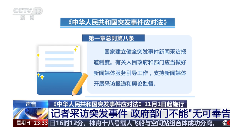 央視網(wǎng)消息:十四屆全國人大常委會第十次會議修訂通過的《中華人民共和國突發(fā)事件應(yīng)對法》自2024年11月1日開始施行。這部法律共八章一百零六條。其中,第一章總則第八條規(guī)定:“國家建立健全突發(fā)事件新聞采訪報道制度。有關(guān)人民政府和部門應(yīng)當(dāng)做好新聞媒體服務(wù)引導(dǎo)工作,支持新聞媒體開展采訪報道和輿論監(jiān)督。”