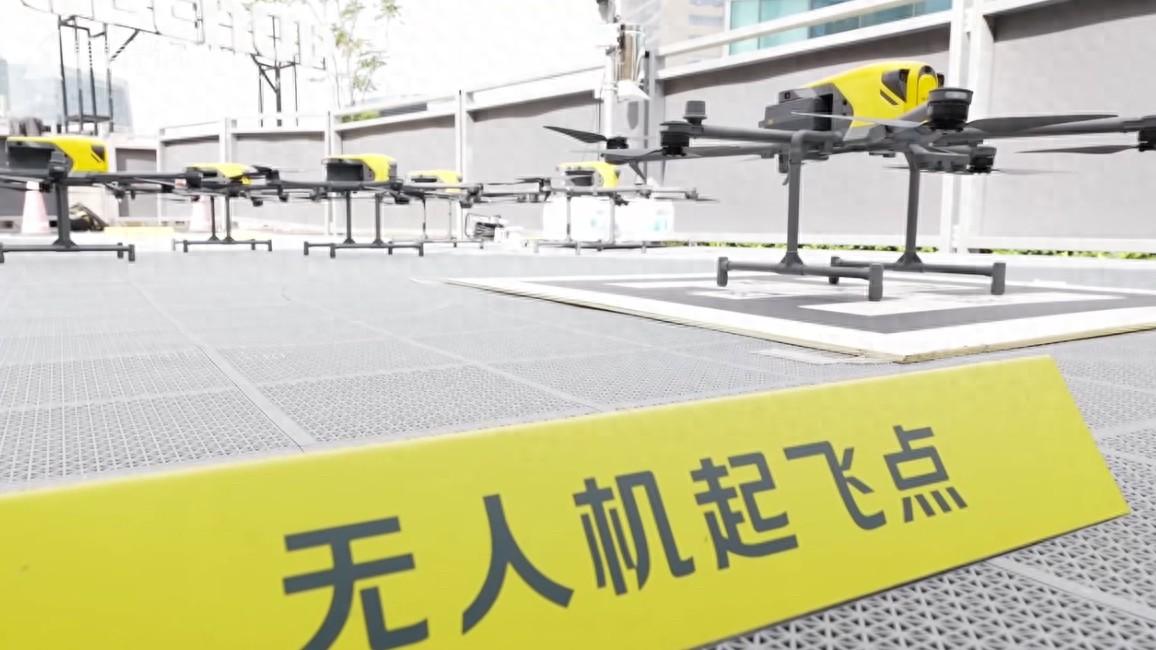 在楊浦區一家商場頂樓的露臺上,十幾架無人機“外賣員”整裝待發。