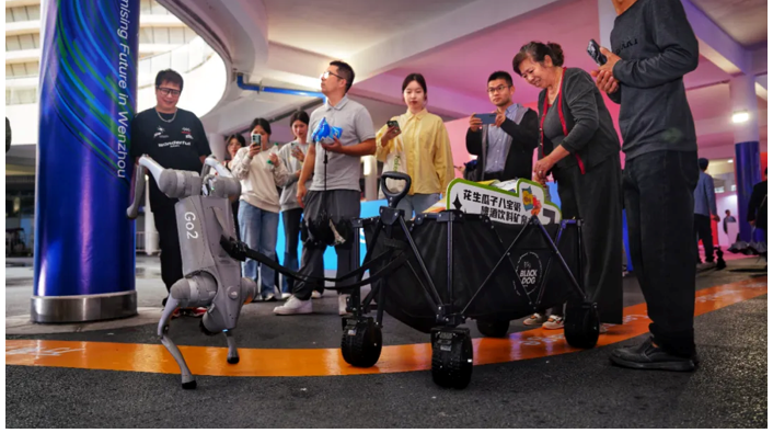 Unitree Go2四足機器人就是網友們熟悉的“機器狗”。這幾天,它又化身“拉車小貨郎”在“萬有引力π”滿場飛奔,不時蹲坐、抬手、倒立、作揖、翻跟頭,招呼著人類,惹得觀眾陣陣發笑。“機器狗功能很強大,而且你叫它做什么就做什么,100%的舔狗,它提供的情緒價值也很重要嘛。”現場一位小哥說。